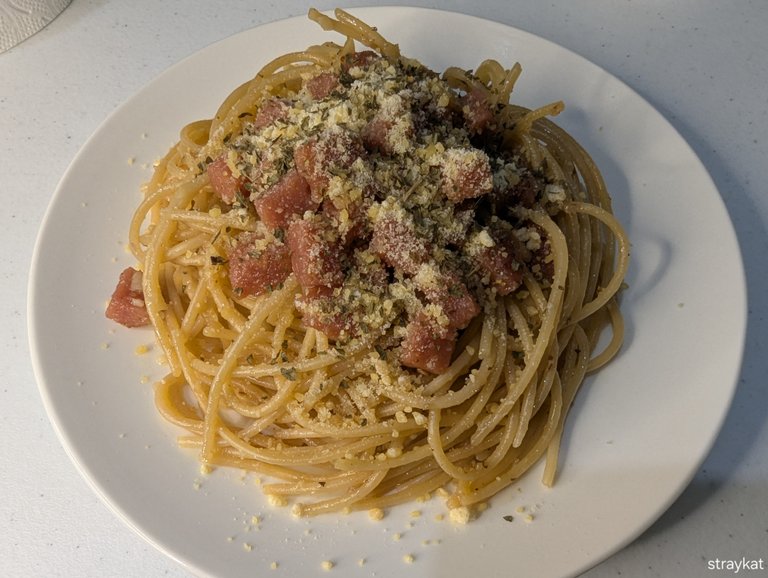 And since I chose not to go out today, I made dinner instead. I still have some spaghetti pasta left so I made the easiest pasta recipe I know—aglio olio. I added some chunks of christmas ham just because it's christmas season. Lol.