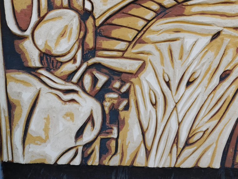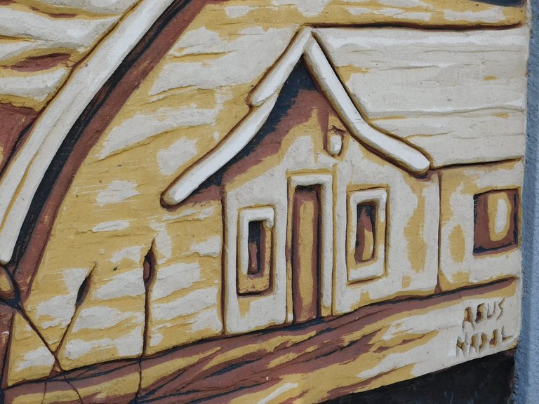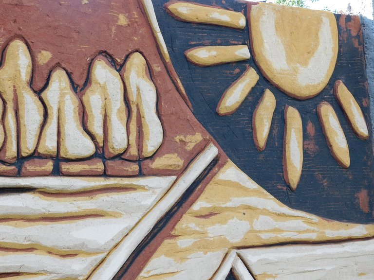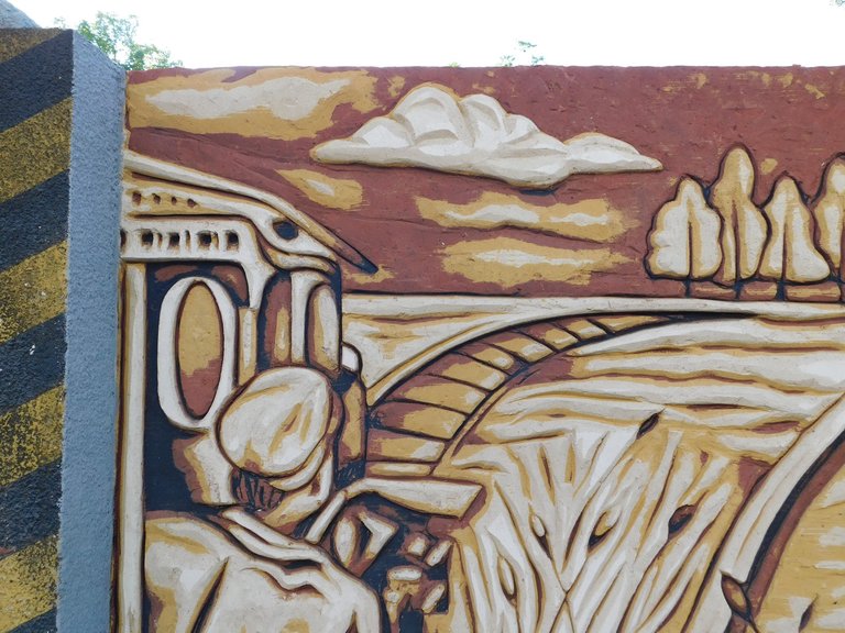 ¨obra¨: que escogí para enseñárselos esta semana, pertenece a uno de que debe tener en su conjunto algo más de 80 metros, y cada mural representa una parte del trayecto del ¨tren¨ ¨antiguo¨ que funcionaba como transporte conectando la ciudad con los diferentes pueblos del interior; el