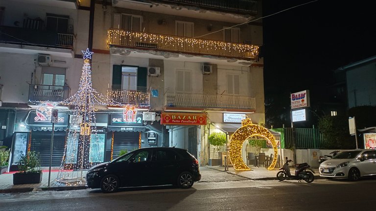 I crossed a semi-deserted Ponticelli street while the businesses open in the evening were busy doing the final cleaning of the day and took a few photos to document the neighborhood's Christmas lighting.