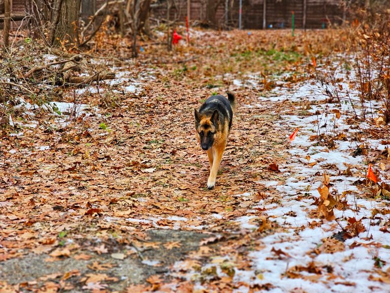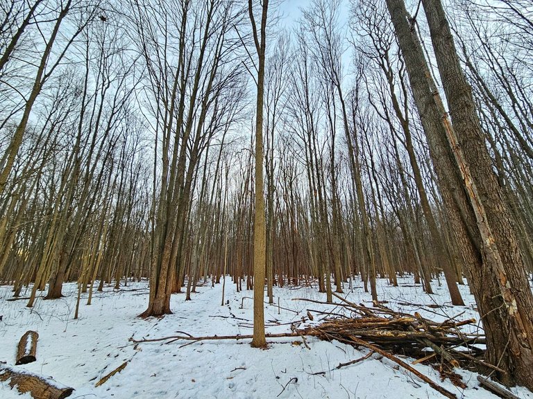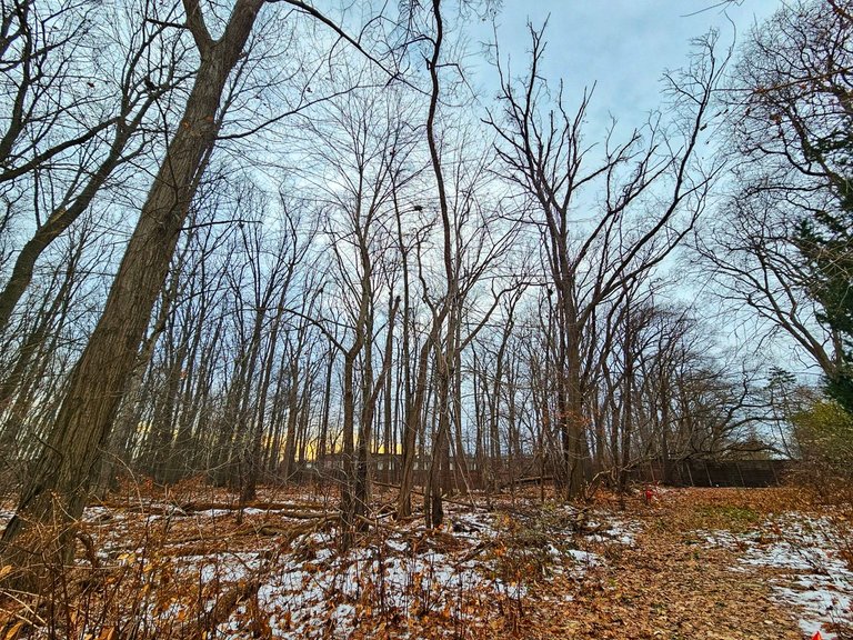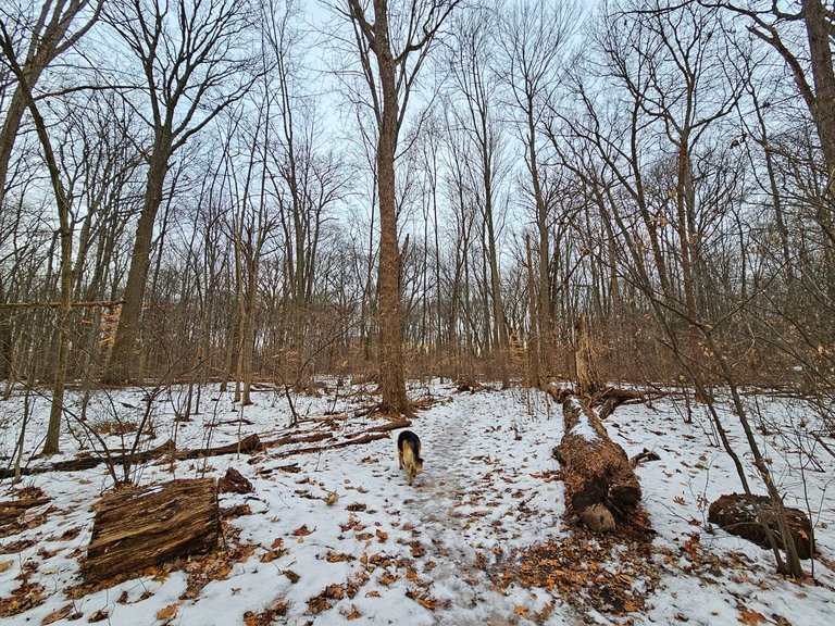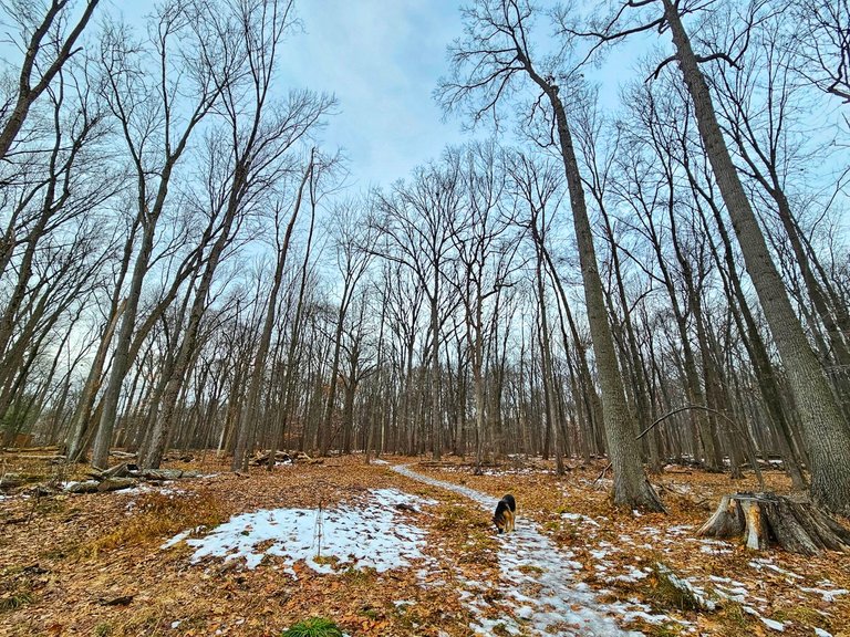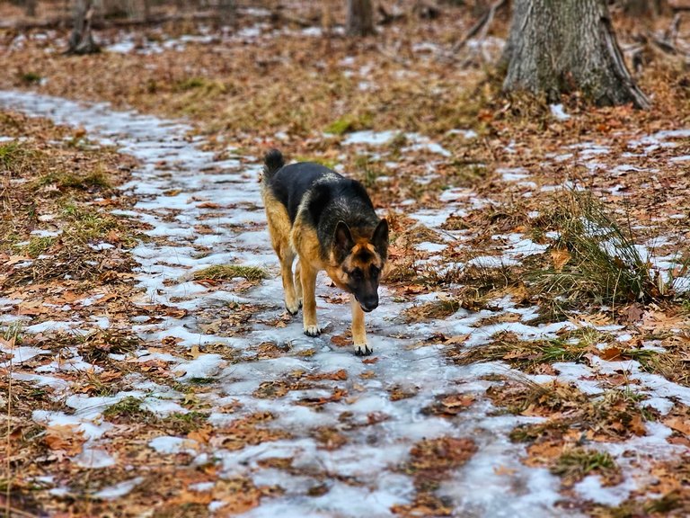 But we quickly went to the bigger forest. The pathway to its entrance is very different now, almost no snow left, but lots of ice. We have to be careful where we step.