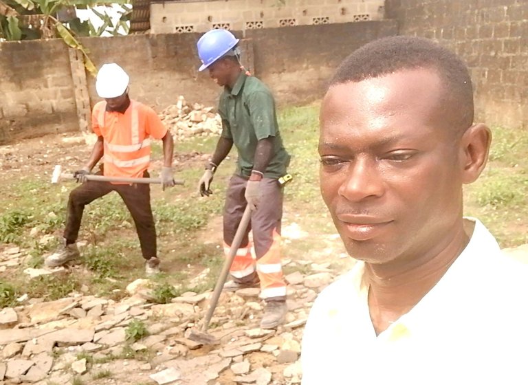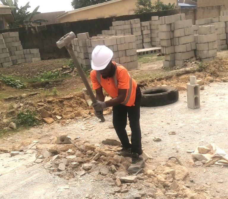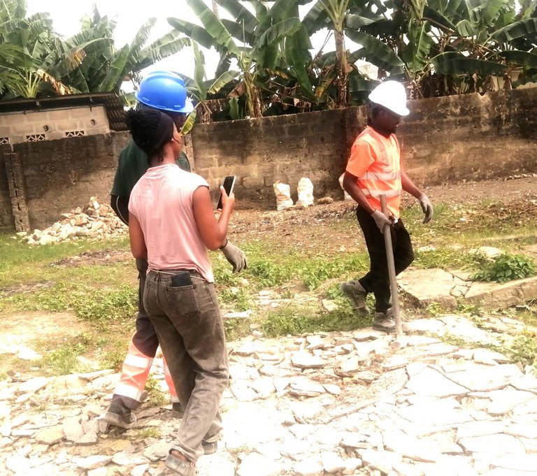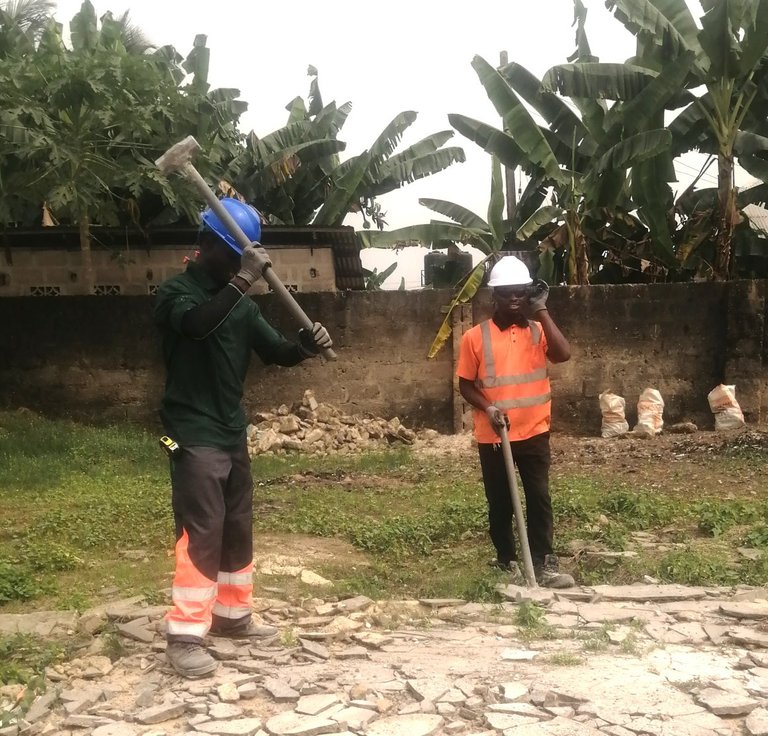 On getting to the construction site, I join other three, two make and one female volunteer to break the existing tiles floor using the heavy harmar. This was actually the part allocated to us.