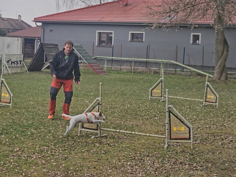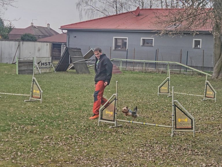 Na cvičáku jsme s Oggym trénovali hlavně slalom. Skákání přes překážky a běhání za frisbee bylo fajn zpestřením celého tréninku.