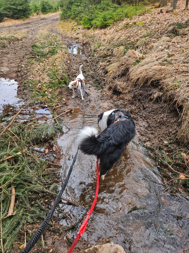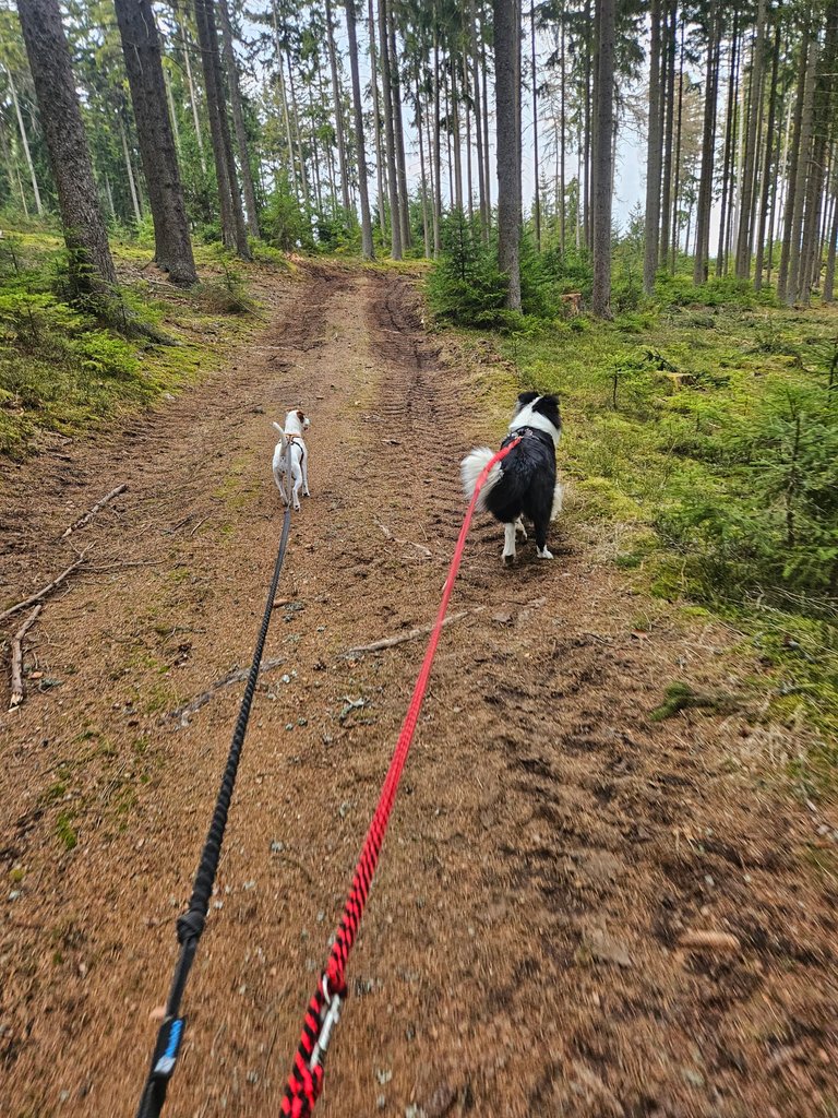 I hit the trails in the woods, visiting spots I hadn’t seen since autumn. I took Cesmína and Dantík with me, and for the first time, I had them both tethered to me. It went surprisingly well 👍 – no major tangling!