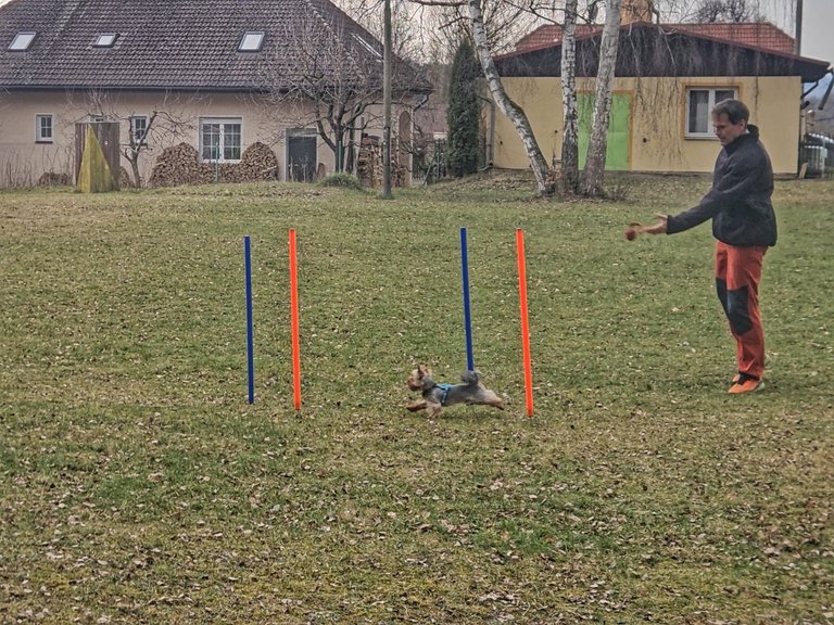 At the training field, Oggy and I mainly practiced the slalom. Jumping over obstacles and chasing the frisbee was a nice way to mix up the session.