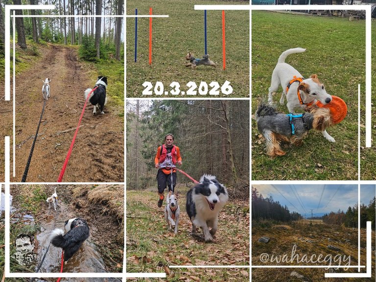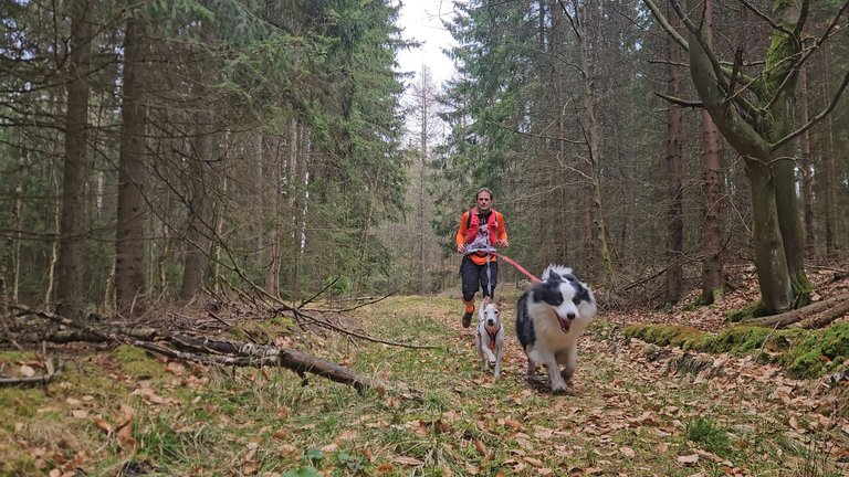 Vyběhl jsem do lesa na místa, kde jsem od podzimu nebyl. Vzal jsem s sebou Cesmínu i Dantíka a poprvé jsem je měl oba uvázané k sobě. Šlo to překvapivě dobře 👍, žádné velké zamotávání se nekonalo.